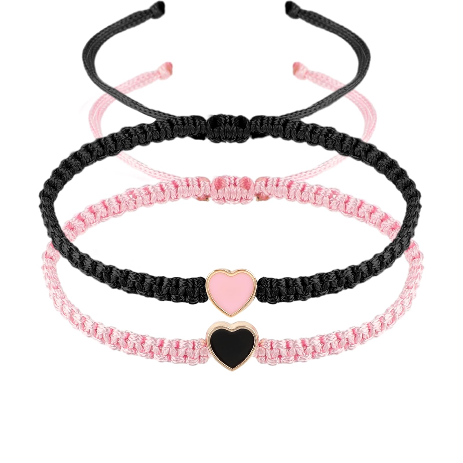 Telooco Set of 2 Colorful Heart Beaded Matching Bracelets for Couples Adjustable Heart Friendships Bracelets set Couples Gift for Anniversary Boyfriend Girlfriend(Black and Pink)