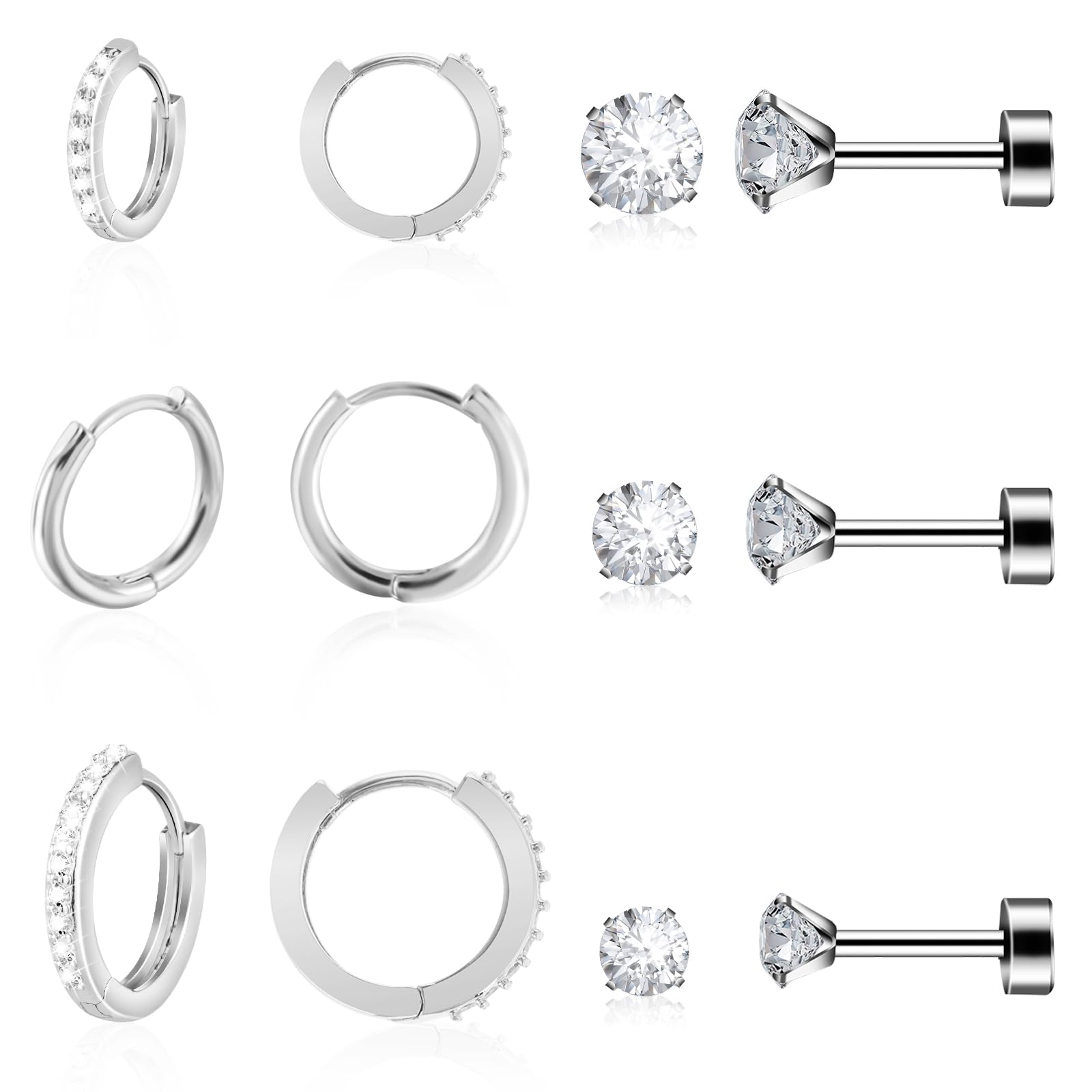 Telooco Silver Earrings Sets for Multiple Piercing 6 Pairs Stainless Steel Earrings Small Huggie Hoop Flat Back Surgical CZ Stud Earrings for Women Cartilage Piercing
