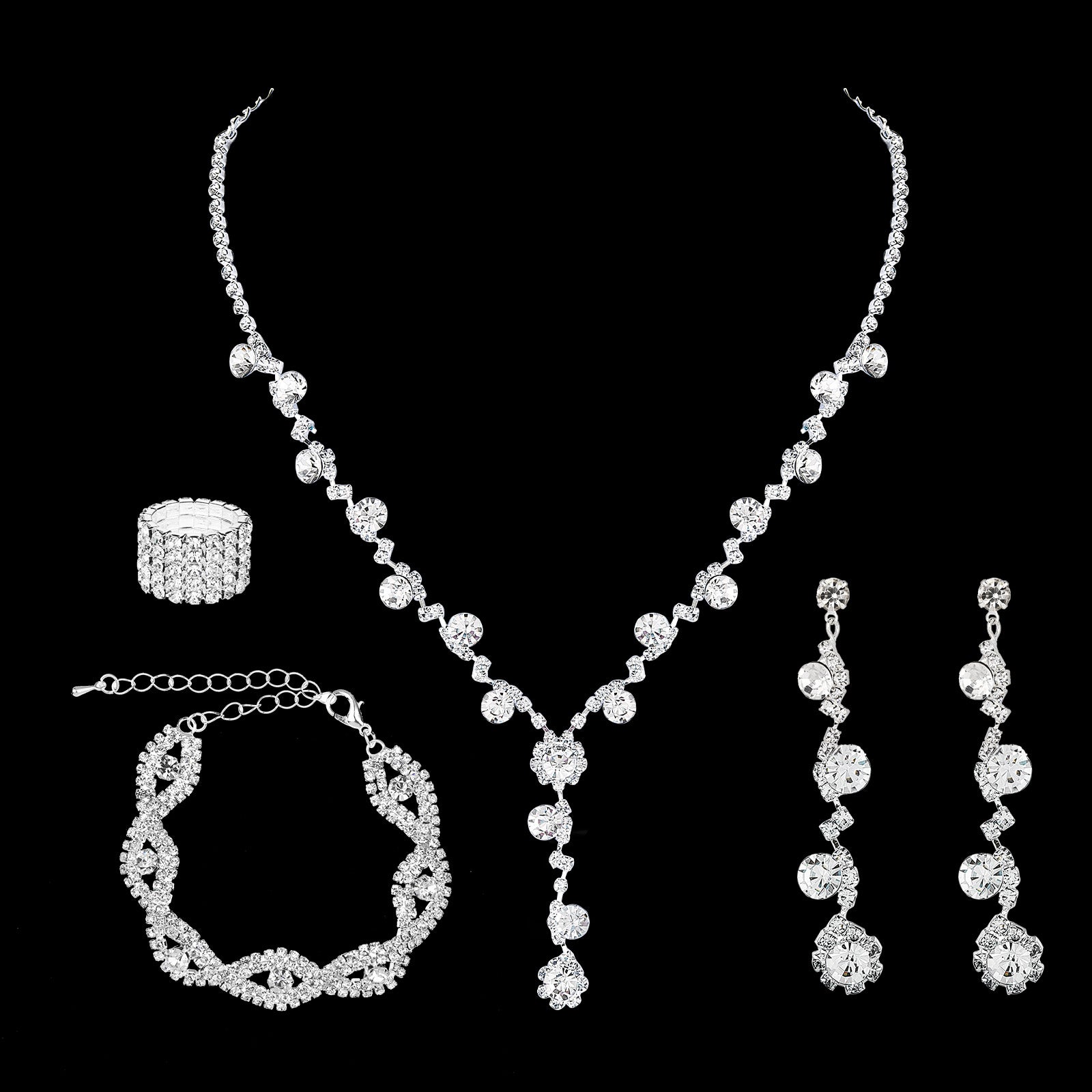 Telooco Silver Rhinestone Jewelry Set Necklace Earrings Bracelets for Women