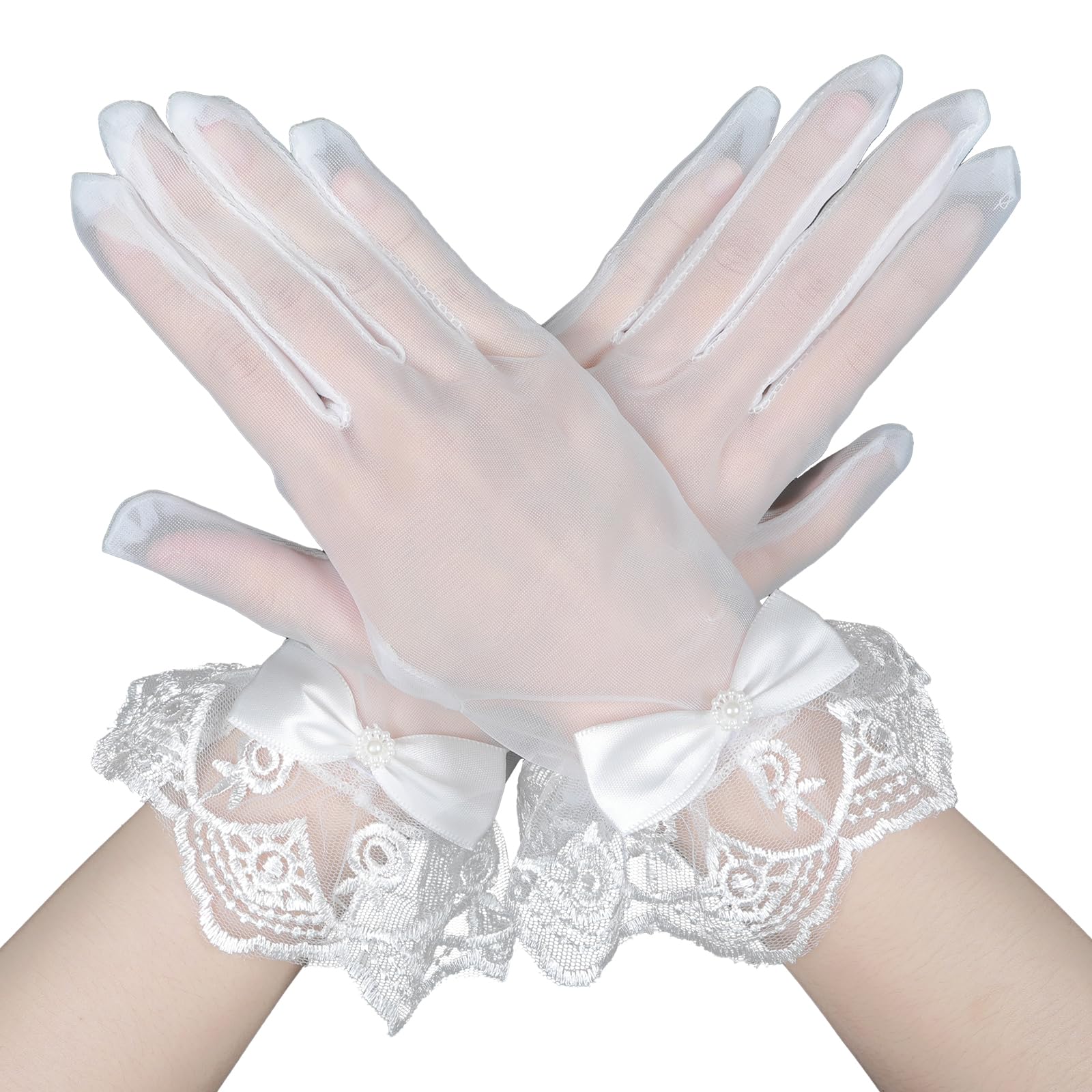 White Lace Gloves for Women with Bow Short Tulle Gloves Sheer White Gloves Fancy Dress Wrist Bridal Gloves for Wedding Prom Halloween Cosplay Tea Party
