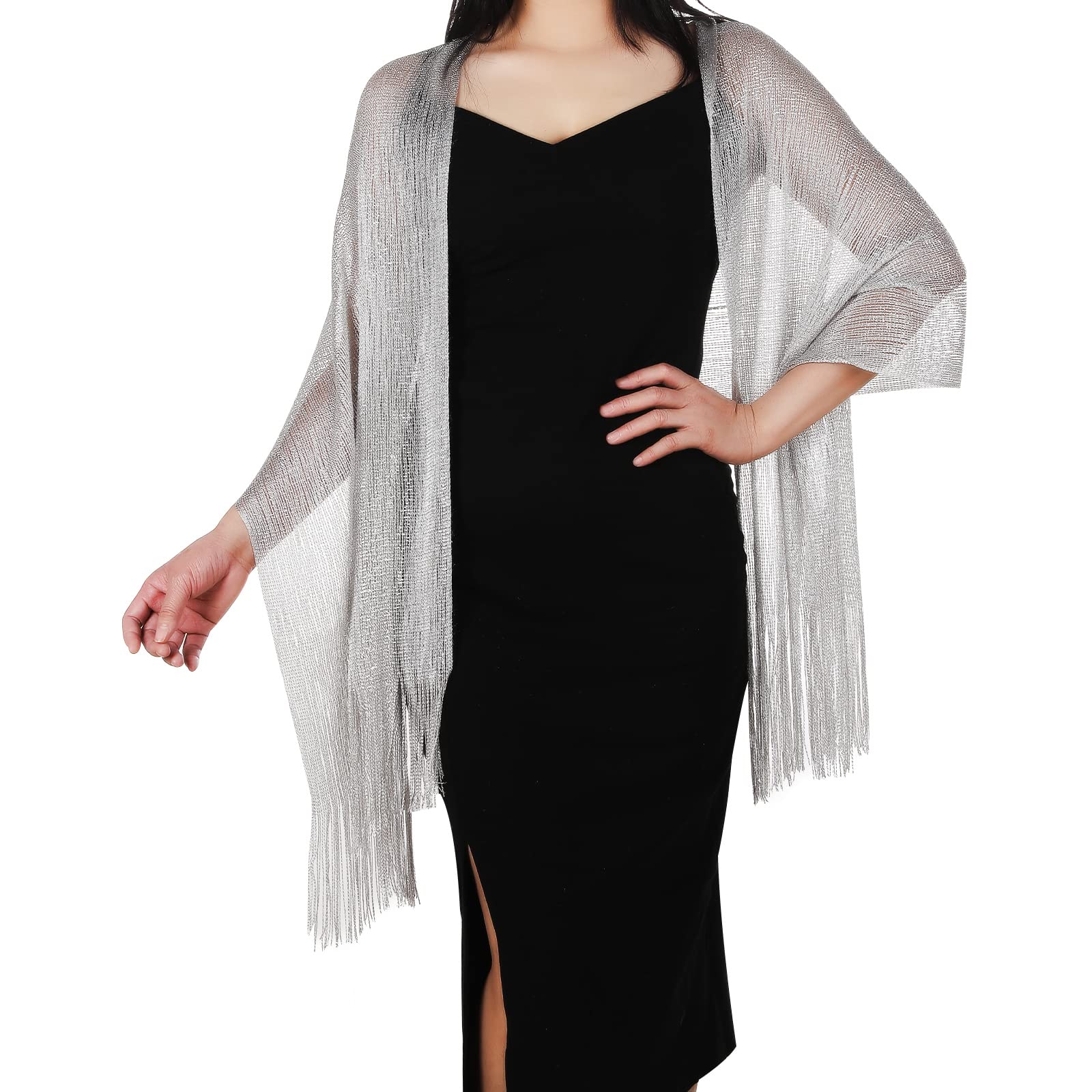 Women's Evening Sparkling Metallic Shawls and Wraps with Scarf Clip, Metallic Scarf for Bridal Weddings/Evening Party/Formal Dresses (Silver Gray)