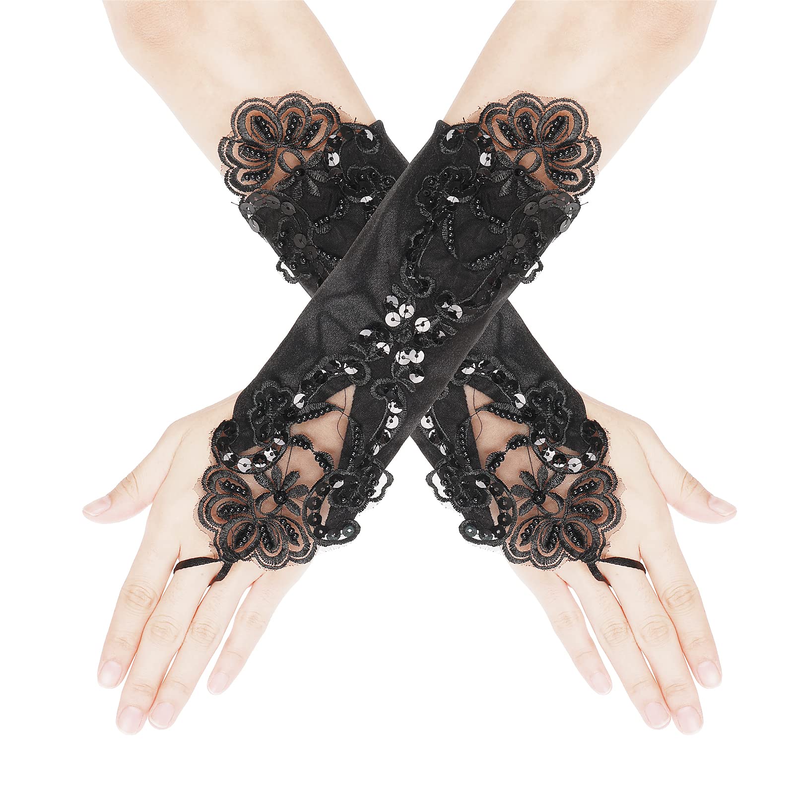 Women's Fingerless Lace Gloves Short Embroidered Opera Gloves 1920s Gloves Bridal Satin Lace Gloves For Wedding Party Masquerade Opera Halloween (Black)