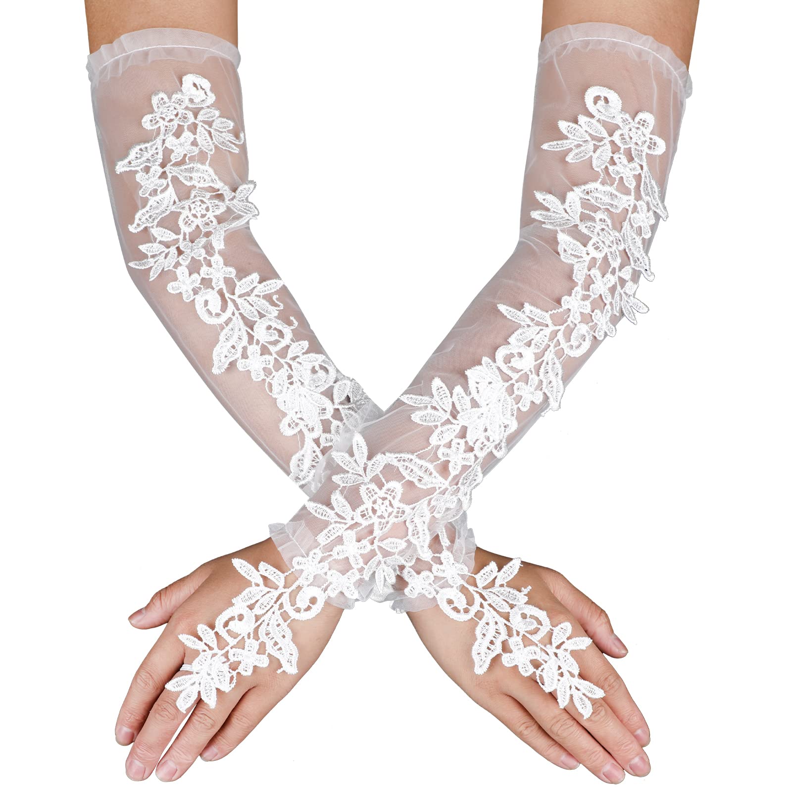 Women's Lace Fingerless Gloves Long Floral Lace Gloves Bridal Prom Gloves for Wedding Party Costume Accessories (White)