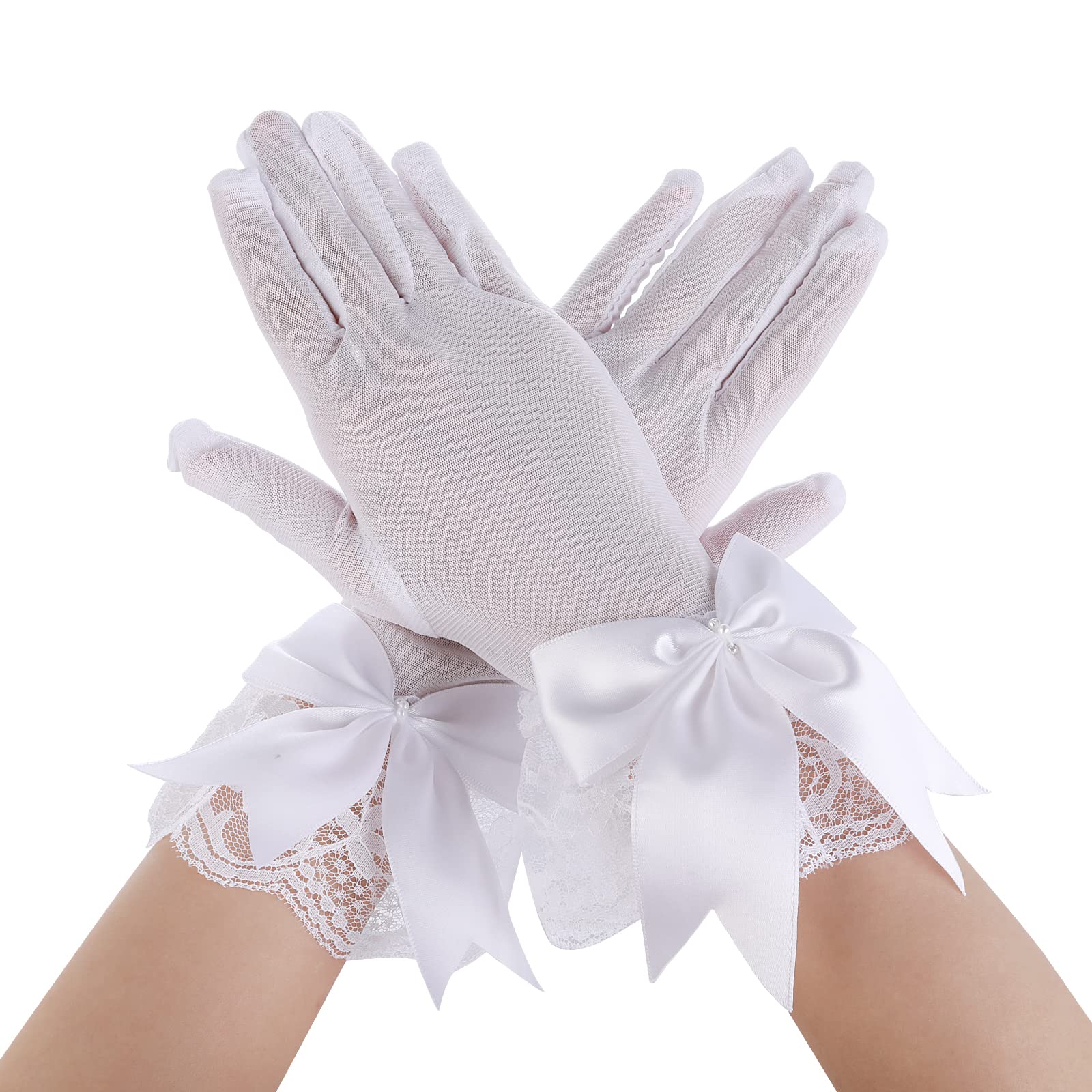 Women's Lace Gloves with Bowknot Vintage Opera Wrist Gloves Stretchy Bridal Gloves for Fancy Dress Wedding Party Tea Party Prom Evening (White)