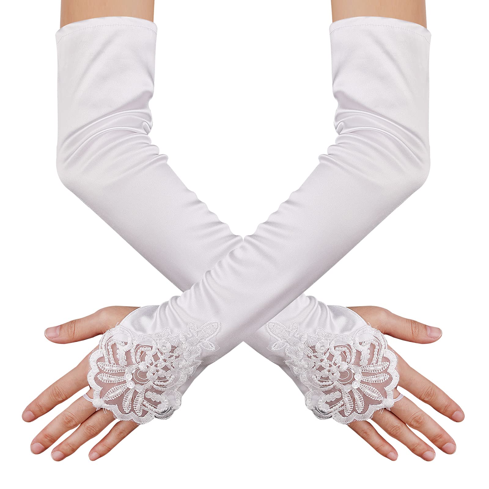 Women's Long Lace Opera Gloves Satin Wedding Bridal Gloves Bridal Dance Gloves Party Stretchy Elbow Length Gloves Fancy Dress Lace Opera Gloves 1920s Gloves for Christmas Halloween (White)
