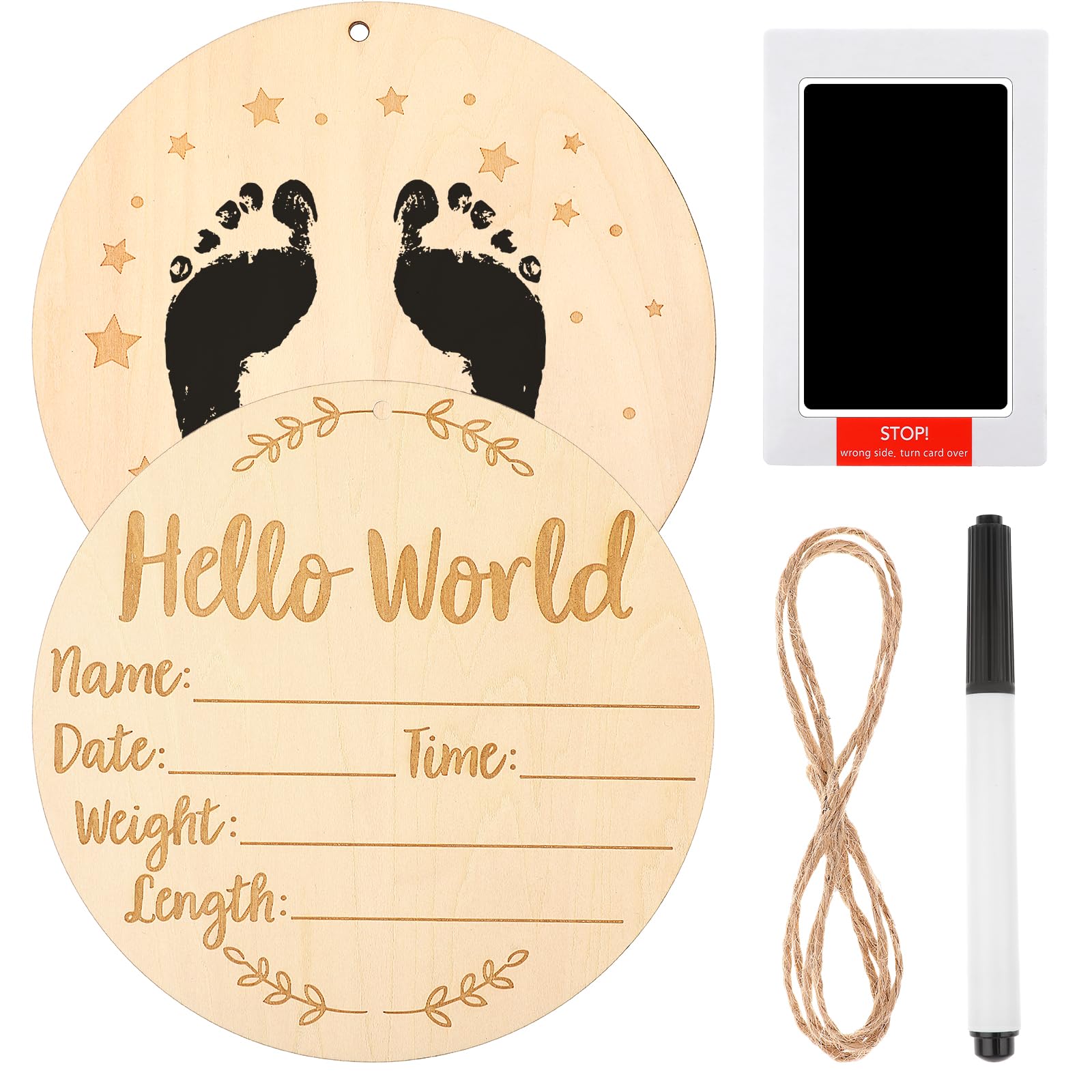 Wooden Baby Announcement Sign 5.9 Inch Round Birth Announcement Sign for Hospital Hello World Newborn Sign with Marker Pen and Ink Pad for Baby Hand and Footprints for Photo Prop Baby Shower Keepsakes