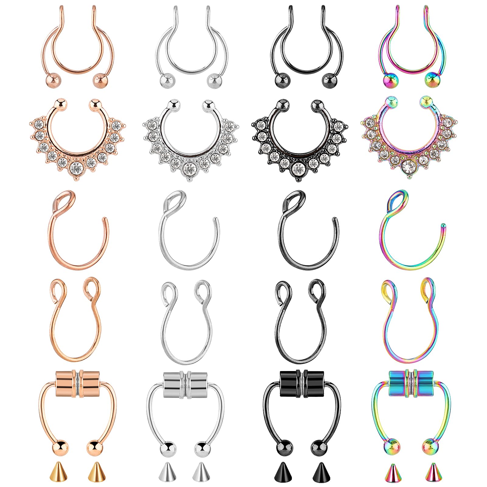 Yolev 20Pcs 16G Fake Nose Rings for Women Non Piercing Faux Nose Cuffs Horseshoes Nose Ring Silver Black Gold Septum Rings Septum Jewelry