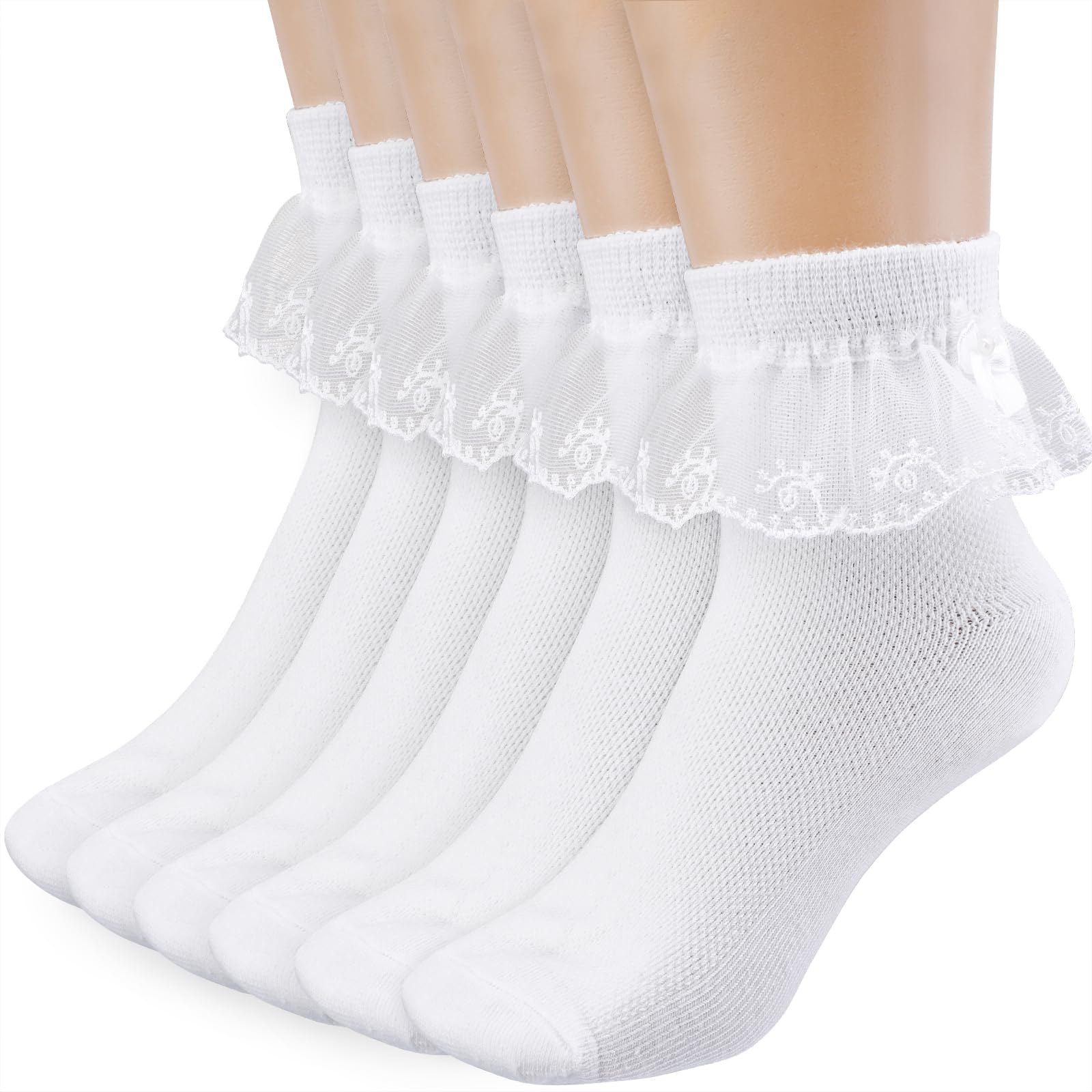 Yolev 3 Pairs Cotton Girls White School Socks White Frilly Lace Top Bows Dance Shimmering Cute Ruffle Comfortable Frilly Fashion Socks