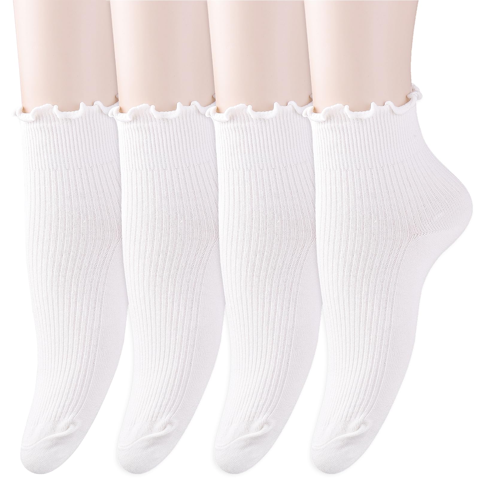 Yolev 4 Pairs Cute Ruffle Ankle Socks for Women Cotton Girls White School Socks White Frilly Lace Top Bows Dance Shimmering Soft Cotton Knit Lettuce Low Cut Frilly Crew Socks