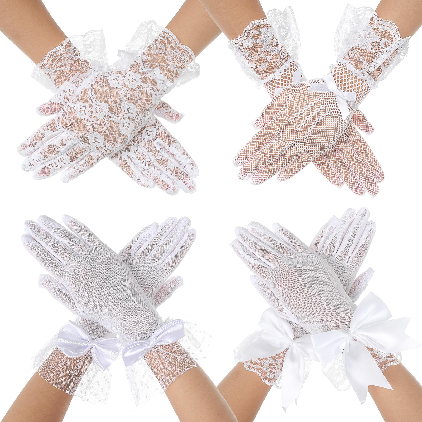 Yolev 4 Pairs Short Lace Gloves Tea Party Glove Lace Floral Bow Gloves Bridal Wedding Gloves for Dinner Prom Evening Banquet Halloween Party for Women (White)