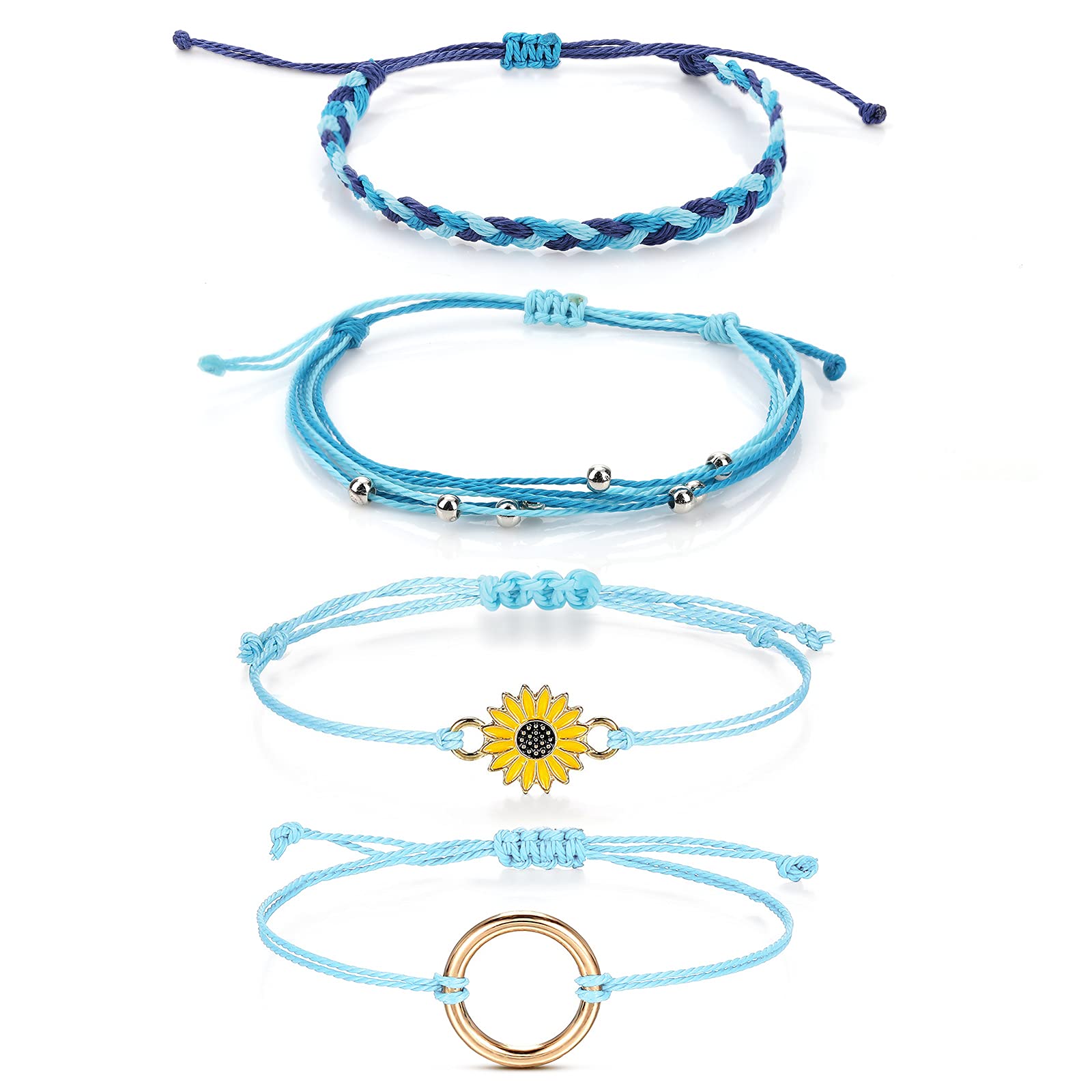 Yolev 4Pcs Bohe Woven Bracelet Handmade Braided Anklet Bracelets String Rope Bracelets Adjustable Wax String Jewelry Boyfriend Girlfriend Friendship Gifts