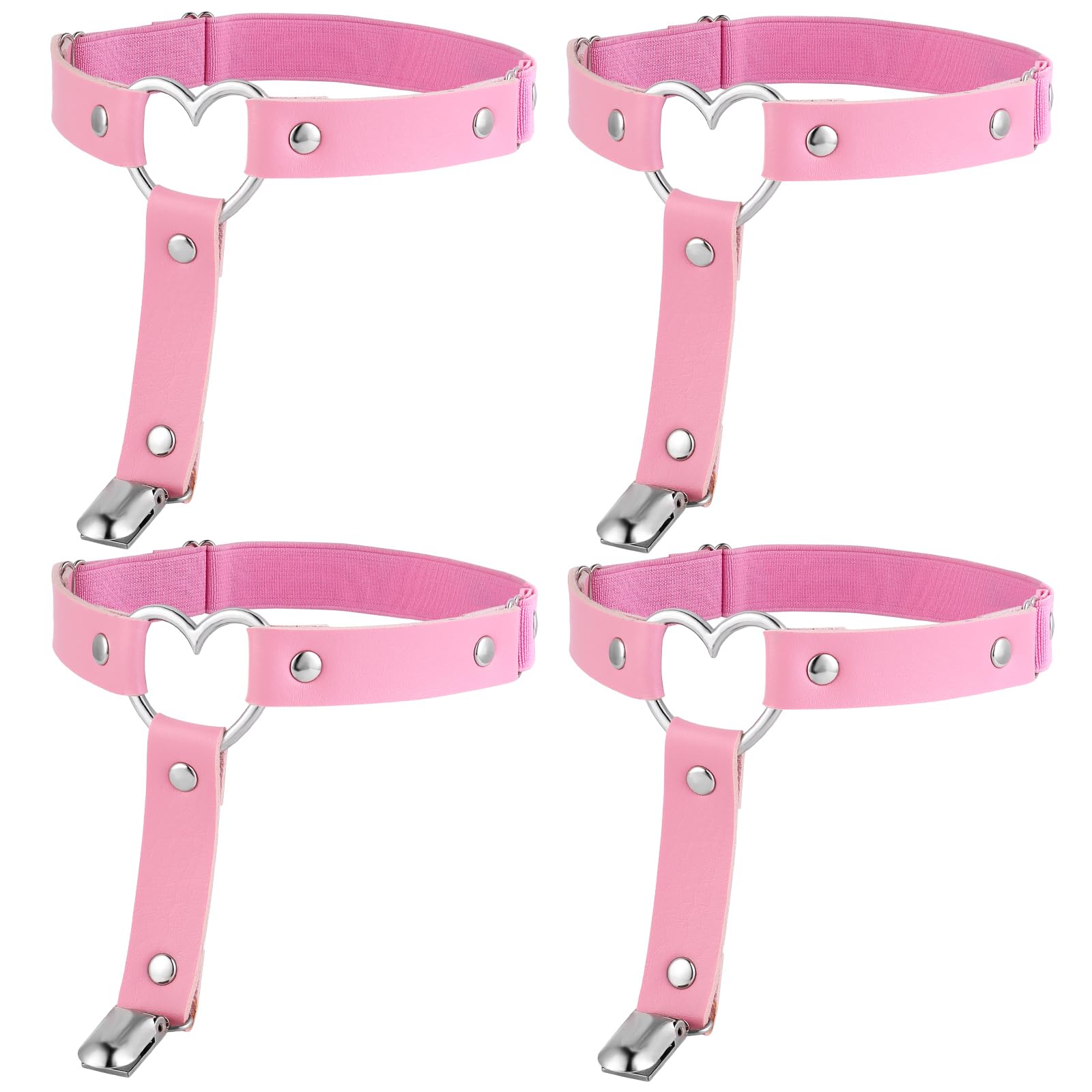 Yolev 4Pcs Women Adjustable Leather Thigh Garter Heart Shaped Leg Garter with Clips Punk Goth Garters for Thigh-high Socks (Pink)