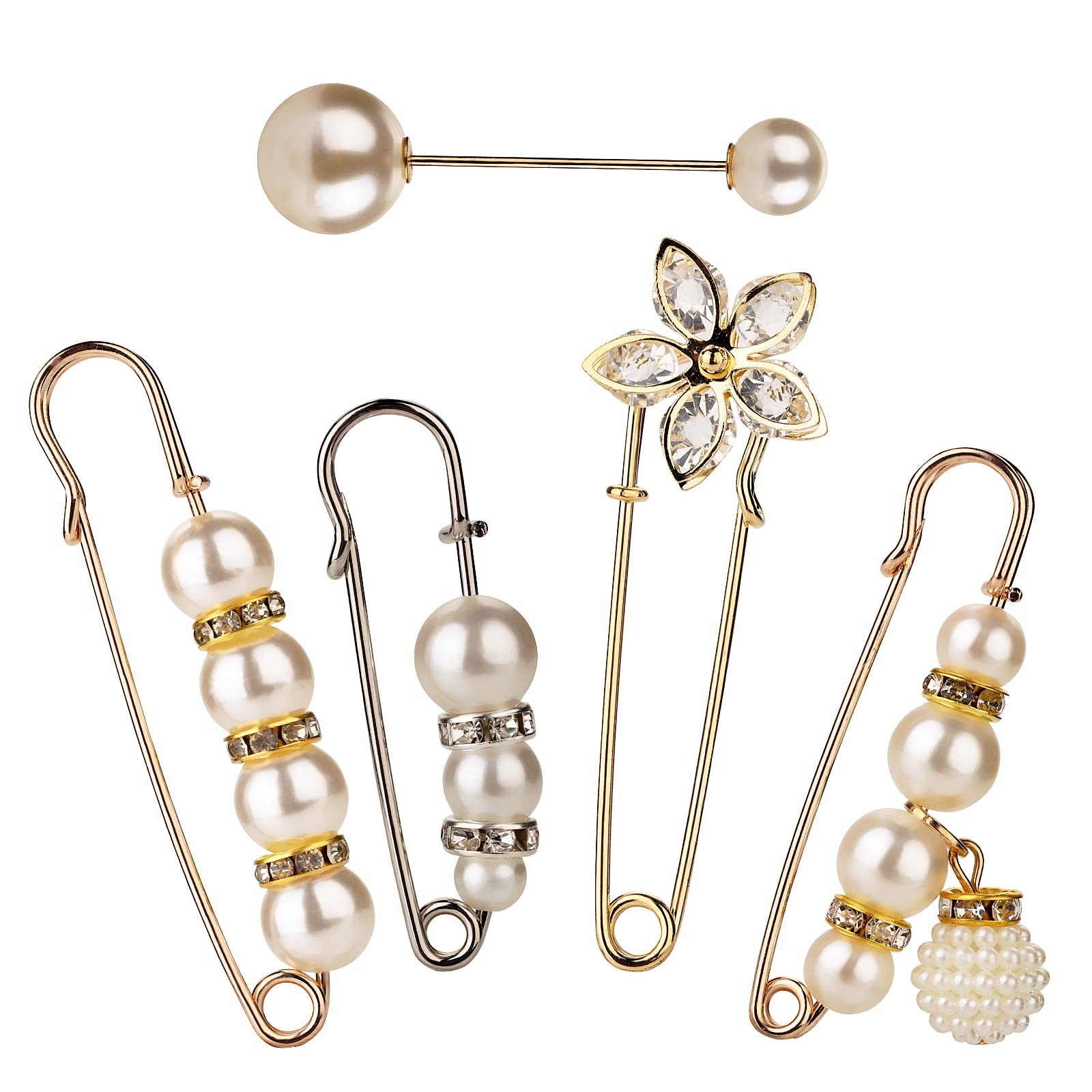 Yolev 5 Pieces Brooch Pins Artificial Pearl Safety Pins Heavy Duty Safety Pins Sweater Shawl Clip Safety Pins Beautiful and Practical Rhinestone Pins for Women