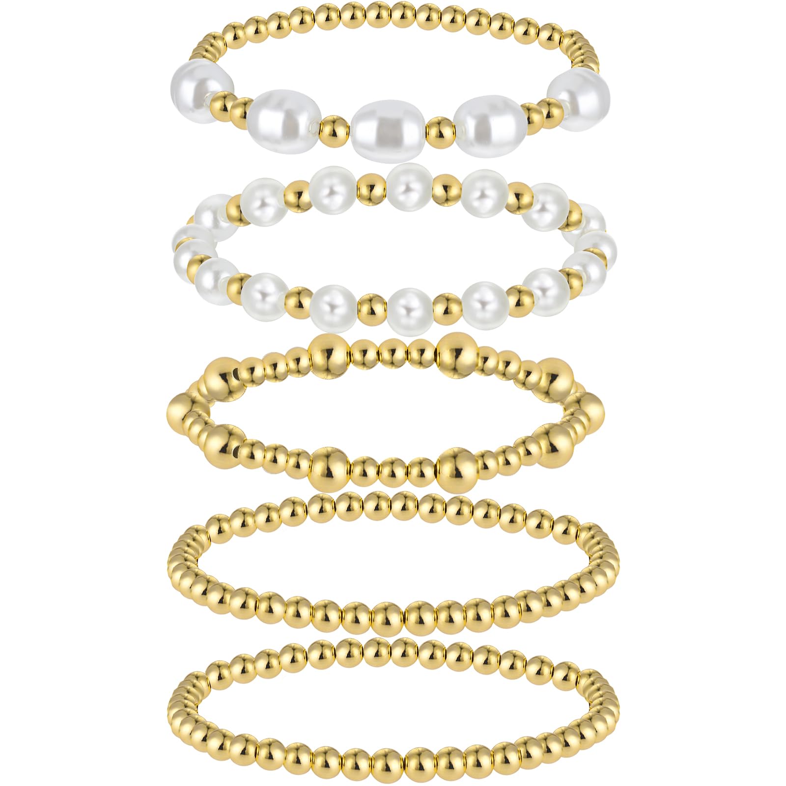 Yolev 5pcs Gold Beaded Bracelets for Women, Pearl Bracelet Set for Women Beaded Stretch Strand Bracelets for Gifts Stackable Stretch Bead Ball Bracelet Set Jewelry Gifts