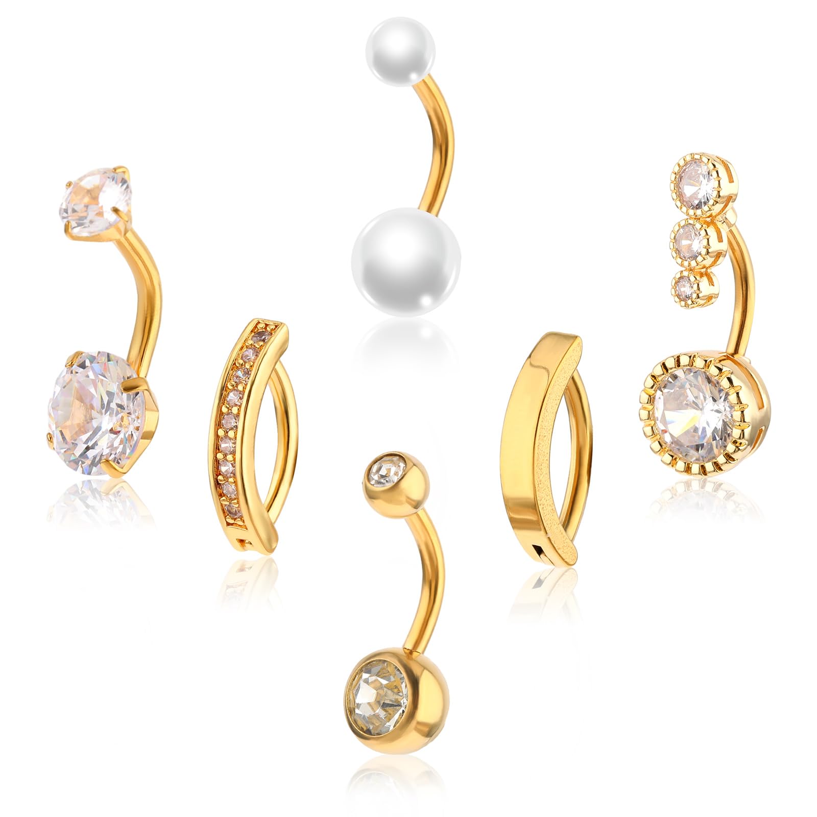 Yolev 6 Pcs Belly Button Bars Dangly Belly Button Piercing Gold Belly Button Ring Ball Stainless Steel Navel Piercing Jewelry Men Various Sizes Round Pearl Diamond