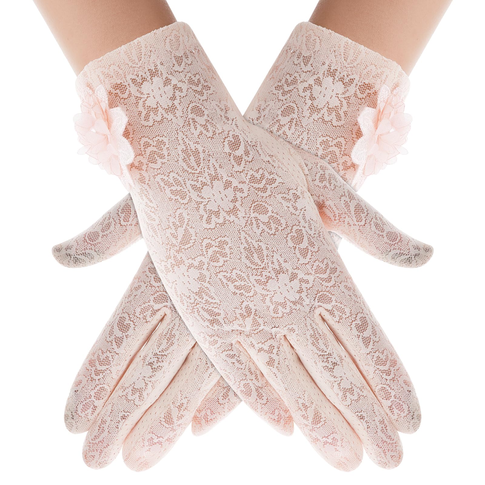 Yolev Floral Ladies Lace Gloves Short Elegant Gloves Stretchy Summer Sun UV Protection Driving Gloves with Touch Screen for Wedding Opera Dinner Party (Pink)