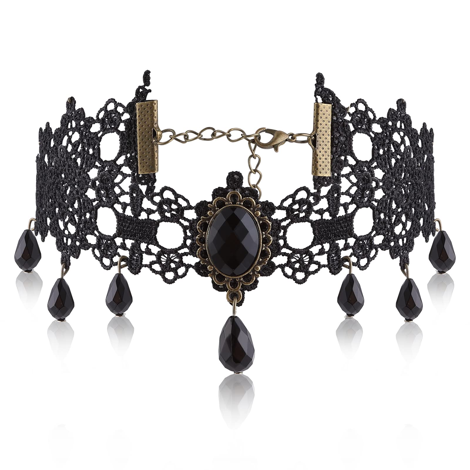 Yolev Gothic Lace Choker Necklace Tattoo Lace Choker Collar Punk Lace Necklace Retro Black Choker Steampunk Vampire Choker with Teardrop Pendant for Women Girls Cosplay Party